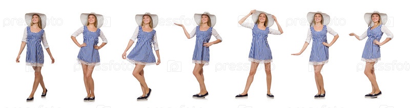 Улыбающаяся женщина в квадратном простом платье и шляпе изолирована на белом