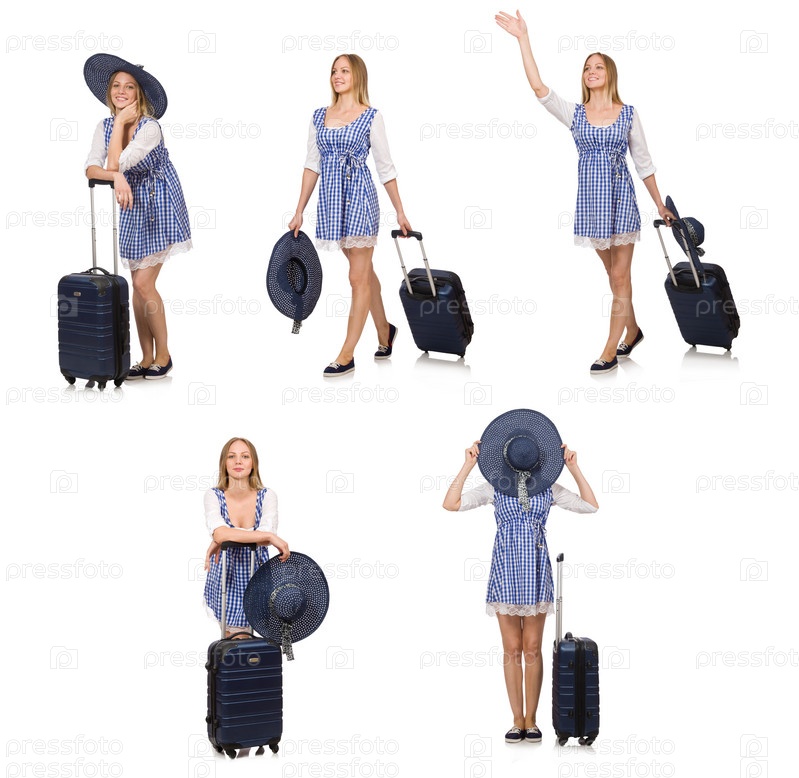 Женщина, готовая к летнему путешествию изолирована на белом