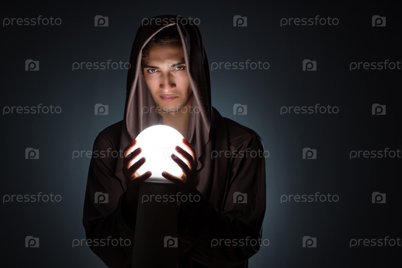 Молодой волшебник с хрустальным шаром в темной комнате