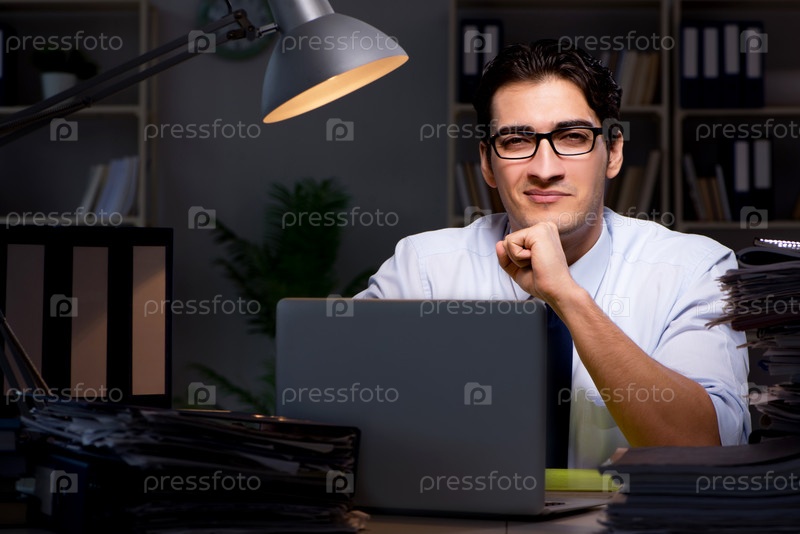 Молодой бизнесмен работает сверхурочно поздно в офисе