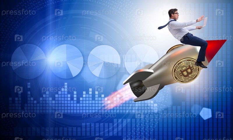 Бизнесмен, летящий на ракете в концепции роста цены биткоина