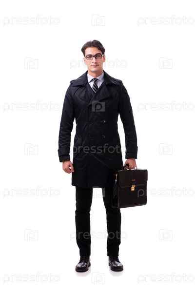 Молодой бизнесмен в зимнем пальто, изолированном на белом