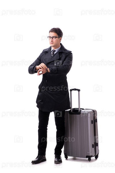 Молодой бизнесмен с чемоданом, готовым к деловой поездке на белом