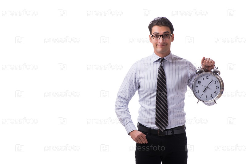 Молодой бизнесмен в концепции управления временем на белом фоне