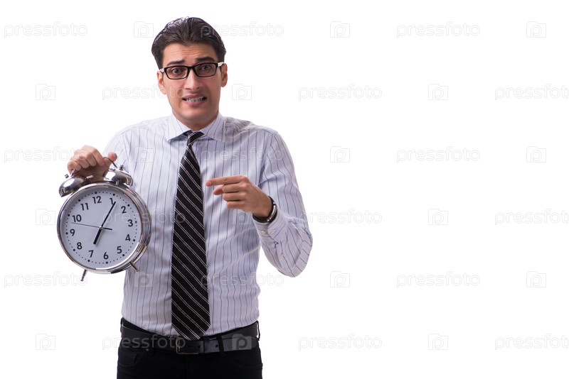 Молодой бизнесмен в концепции управления временем на белом фоне