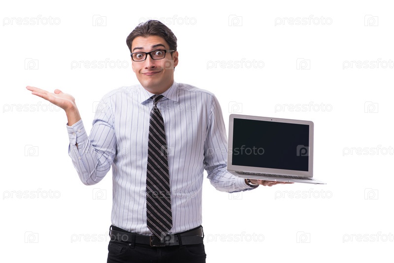 Молодой бизнесмен с ноутбуком, изолированным на белом фоне