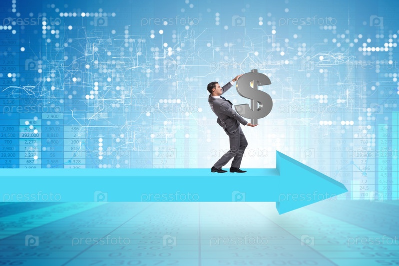 Бизнесмен с долларом, идущий по знаку со стрелкой