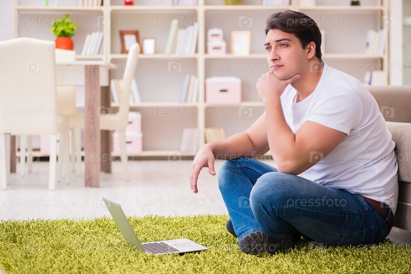 Мужчина работает над ноутбуком дома на ковровом полу