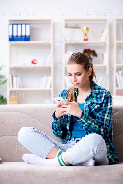Студентка, сидящая на диване с мобильным