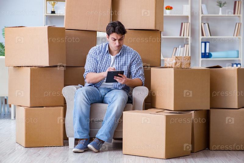 Молодой человек переезжает в новый дом с коробками