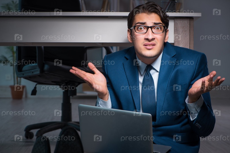 Бизнесмен, работающий сверхурочно долгие часы поздно в офисе