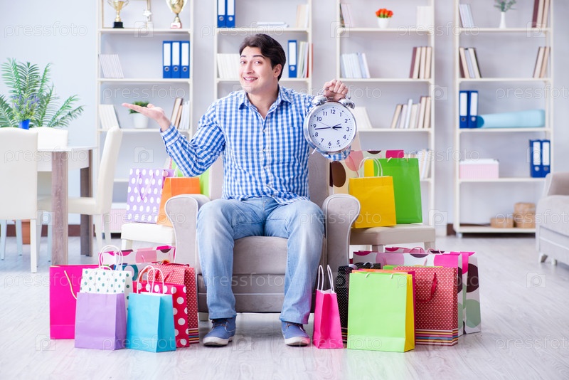 Молодой человек после чрезмерных покупок дома