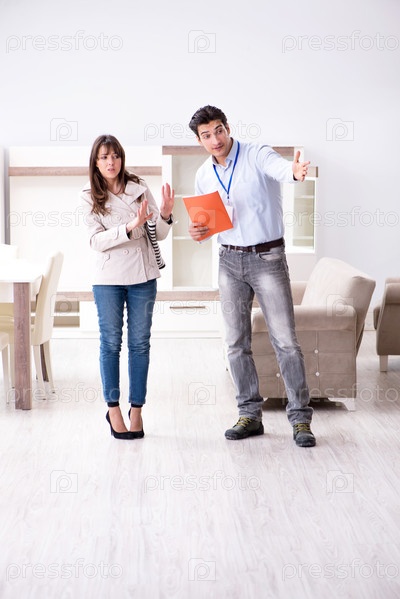 Продавец объясняет женщине-клиенту в мебельном магазине
