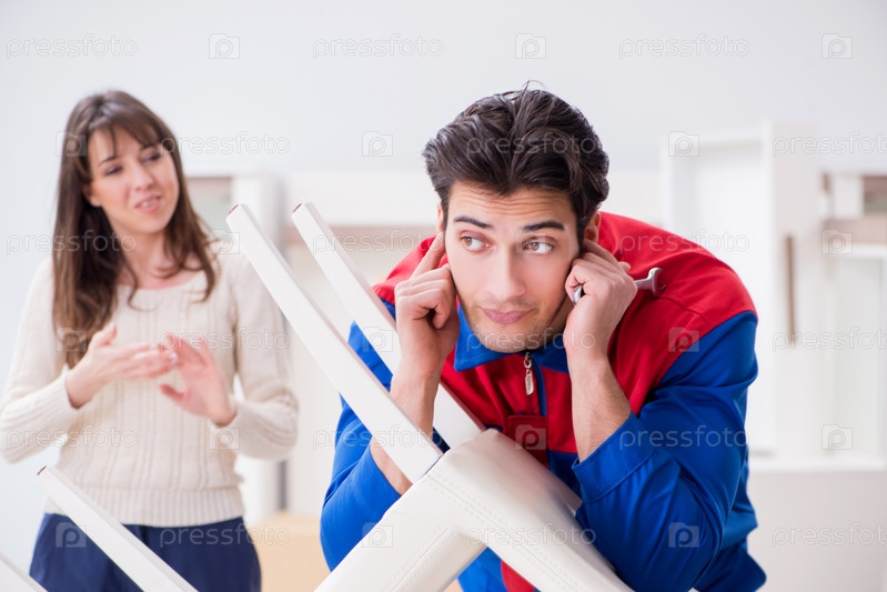 Подрядчик-ремонтник собирает мебель под надзором женщины