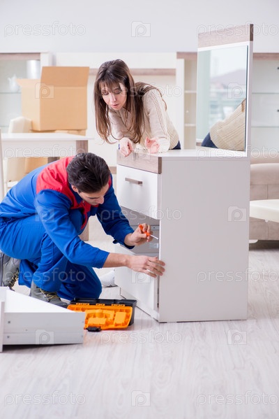 Подрядчик-ремонтник собирает мебель под надзором женщины