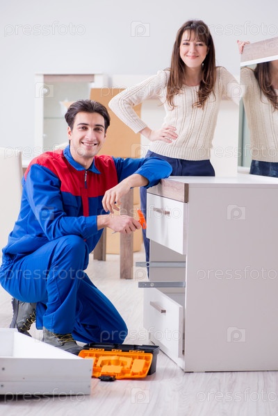 Подрядчик-ремонтник собирает мебель под надзором женщины