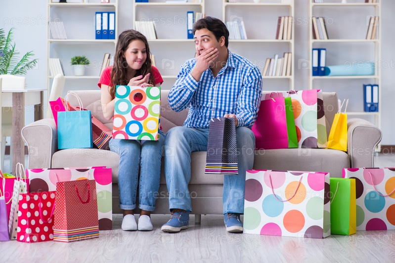 Молодая пара после покупок со многими сумками