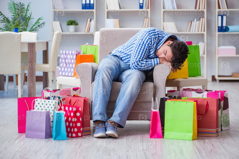 Молодой человек после чрезмерных покупок дома