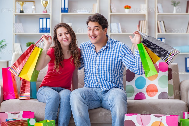 Молодая пара после покупок со многими сумками