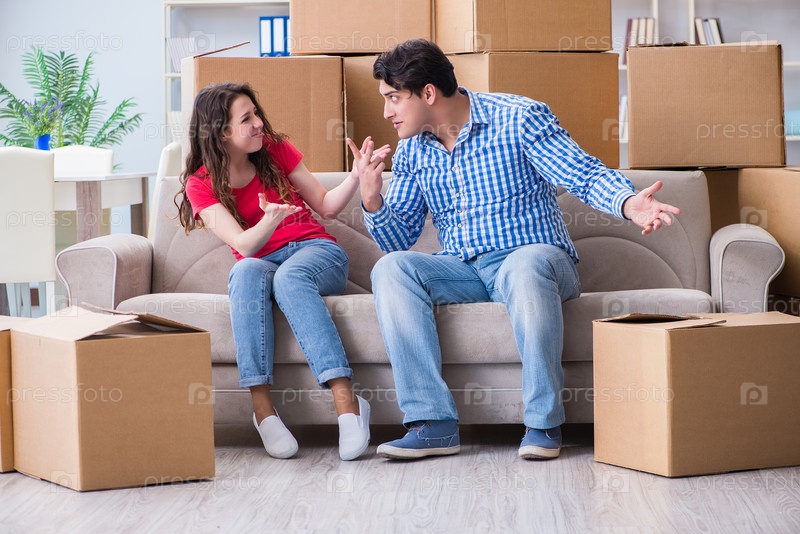 Молодая пара переезжает в новый дом с коробками