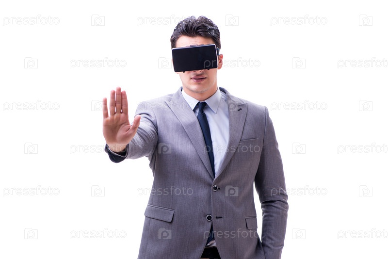 Бизнесмен, носящий очки виртуальной реальности VR изолированные на белом