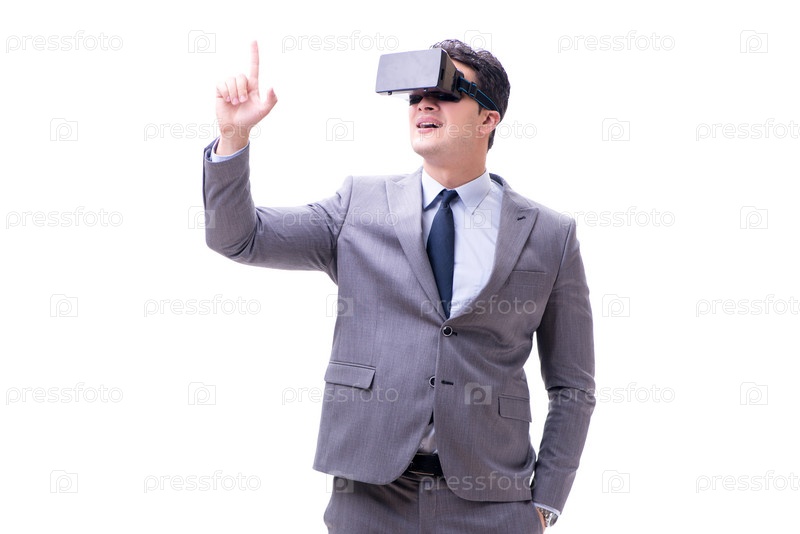 Бизнесмен, носящий очки виртуальной реальности VR изолированные на белом
