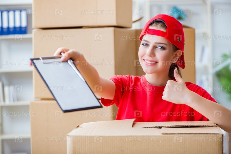 Молодая женщина доставляет коробки с личными вещами