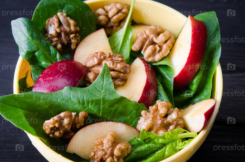 Салат из шпината с орехами и яблоками подается на стол