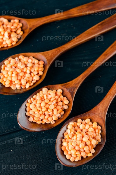 Ложки, наполненные сырым чечевицей для супа