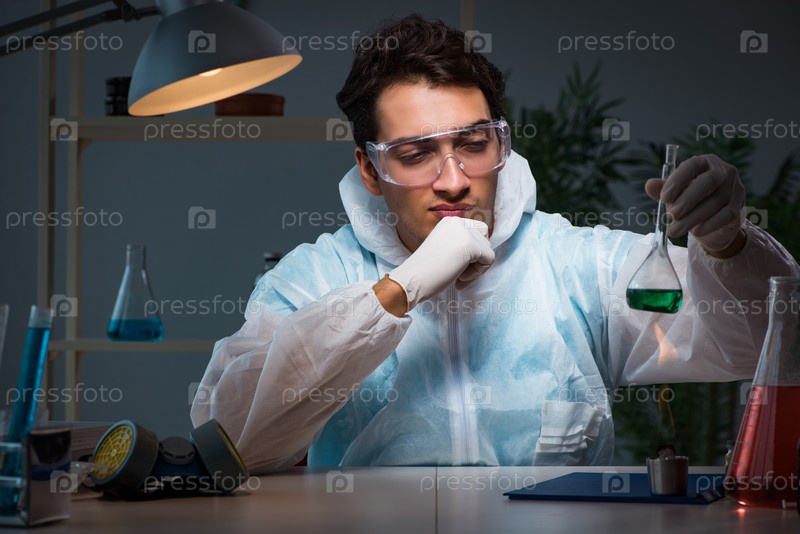 Молодой мужской химик из лаборатории поздно ночью в сверхурочном режиме