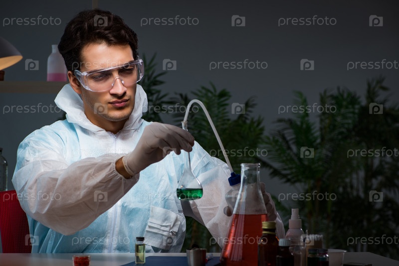 Молодой мужской химик из лаборатории поздно ночью в сверхурочном режиме