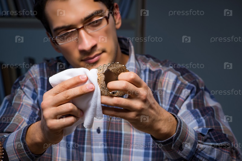 Молодой ювелир, работающий ночью в своей мастерской