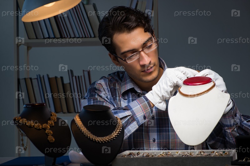 Молодой ювелир, работающий ночью в своей мастерской