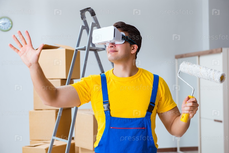 Подрядчик-маляр, работающий с очками виртуальной реальности