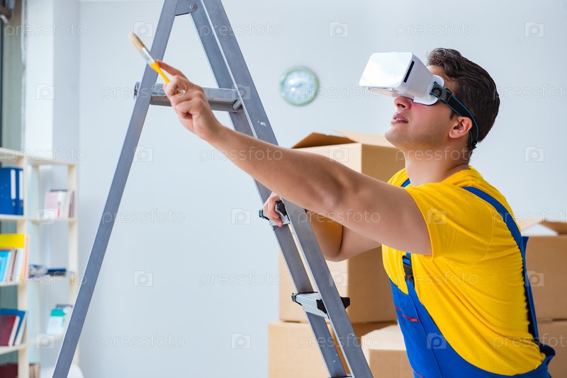 Подрядчик-маляр, работающий с очками виртуальной реальности