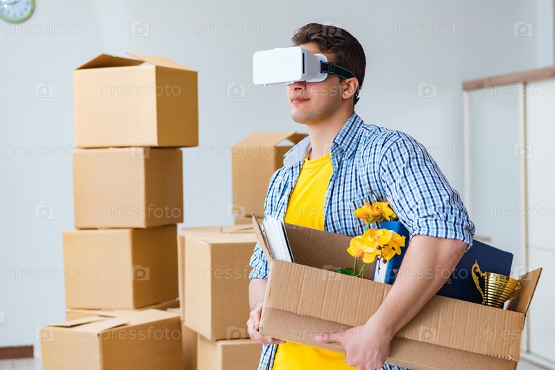 Молодой человек с очками VR переезжает в новую квартиру