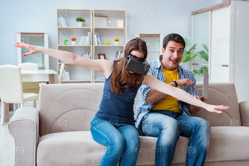 Молодая семья играет в игры с очками виртуальной реальности