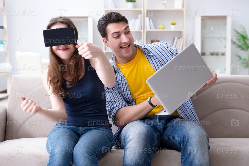 Молодая семья играет в игры с очками виртуальной реальности
