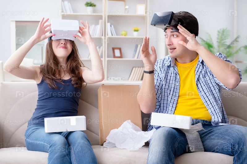 Молодая семья играет в игры с очками виртуальной реальности