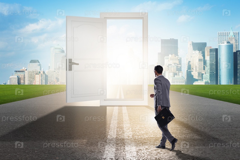 Бизнесмен перед дверью в концепции бизнес-возможностей