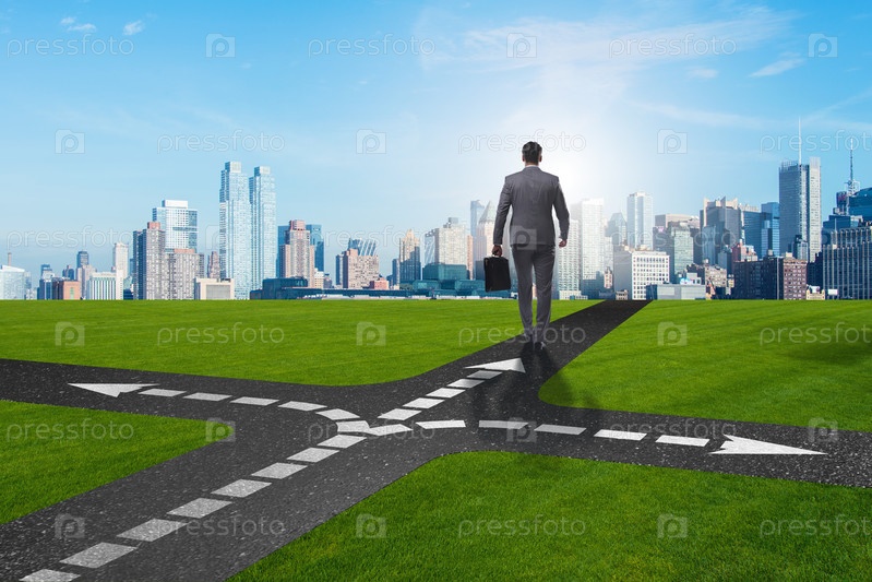 Молодой бизнесмен на перекрестке в концепции неопределенности