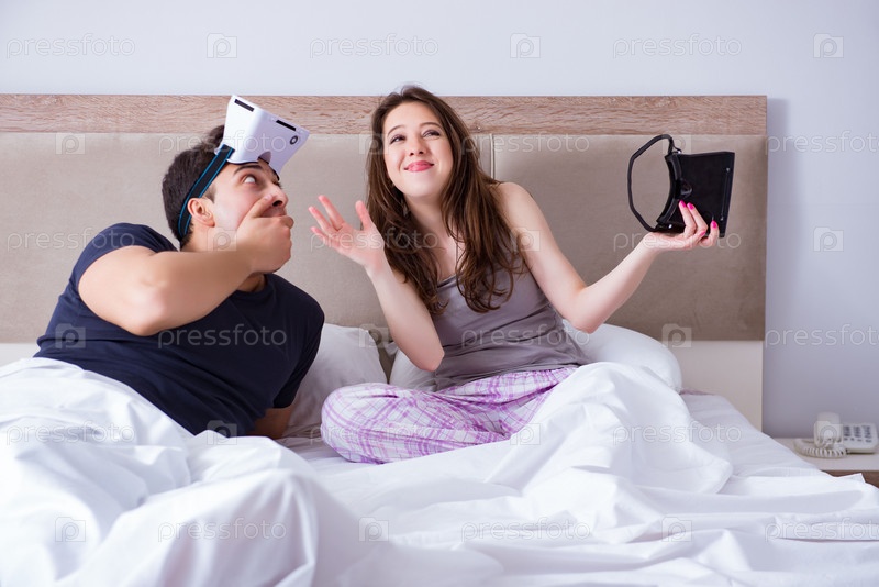 Жена и муж с очками виртуальной реальности в постели