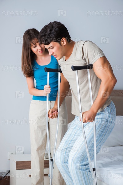 Молодая жена поддерживает мужа на костылях после травмы