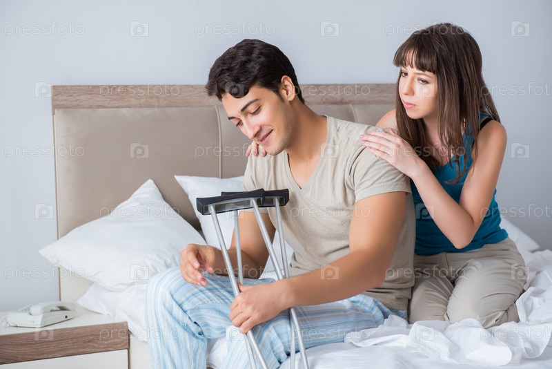 Молодая жена поддерживает мужа на костылях после травмы