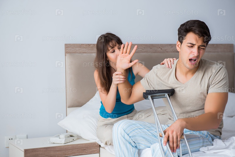 Молодая жена поддерживает мужа на костылях после травмы