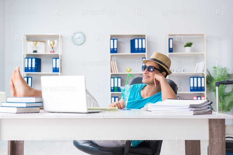 Бизнесмен готовится к отдыху в офисе
