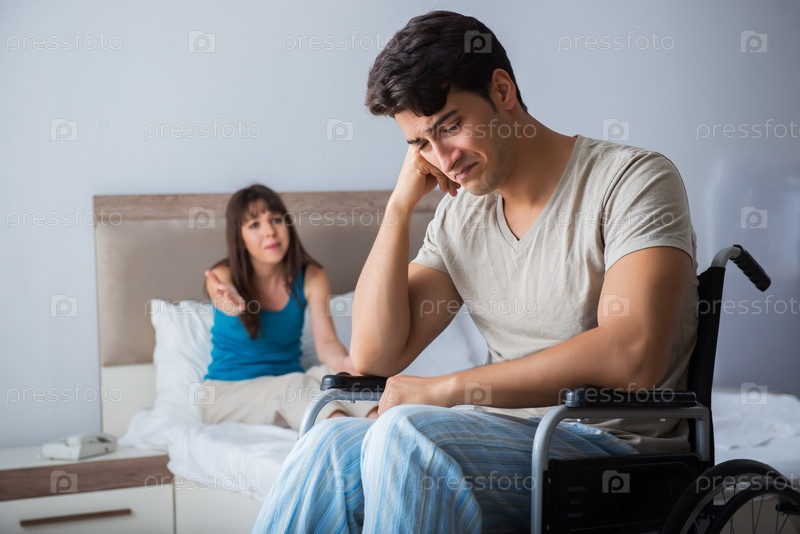 Отчаянный мужчина в инвалидном кресле со своей грустной женой