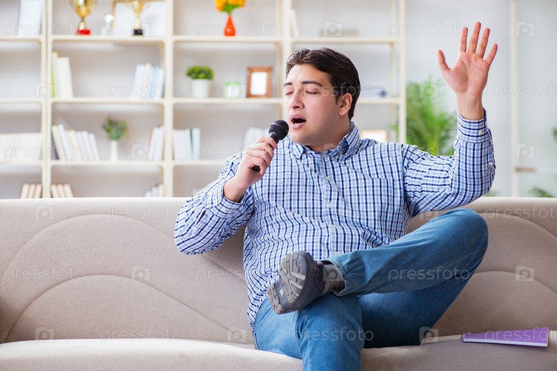 Забавный мужчина поет песни на караоке дома