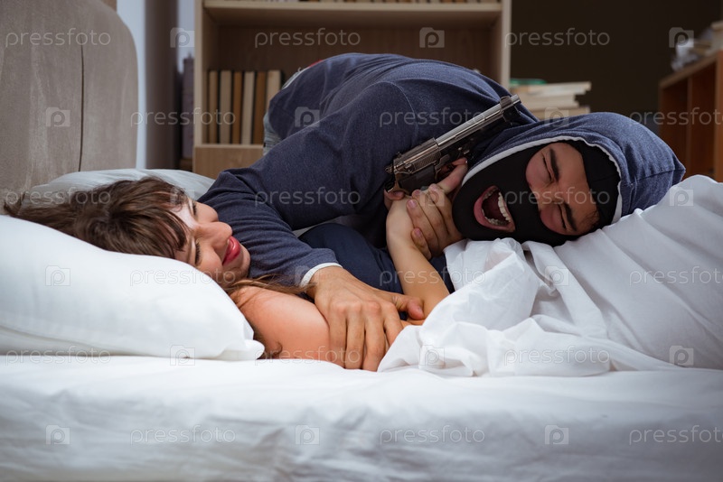 Вор, врывающийся в дом ночью к спальне со спящей раной