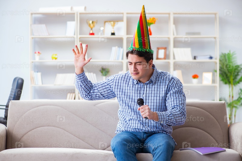 Забавный мужчина поет песни на караоке дома